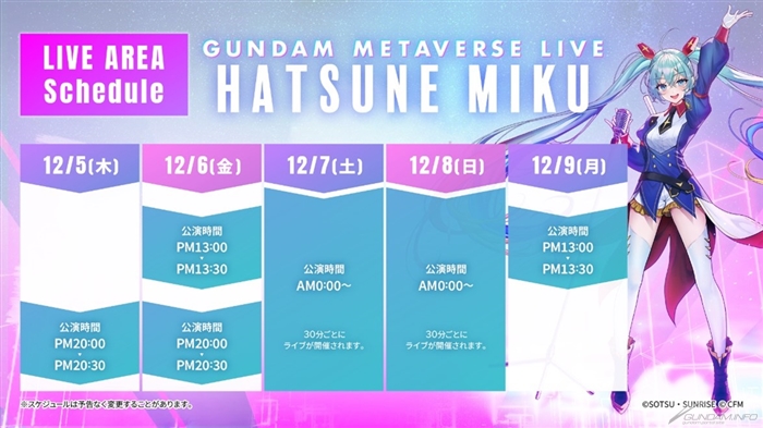 Il Gundam Metaverse Live sarà il primo round del progetto speciale di collaborazione con Hatsune Miku. Chiunque abbia avuto accesso al Metaverso di Gundam può godersi questa performance.