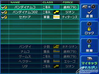 ▲下画面で、ロックや削除などすれ違い通信の設定を行おう。すれ違い通信を設定すると、自動的に自分のパイロット&モビルスーツデータが他のプレイヤーと交換される。
