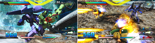 ▲ Its special melee transforms it to a mobile armor (left) or activates its EX burst (right.)