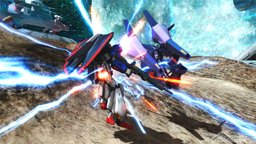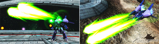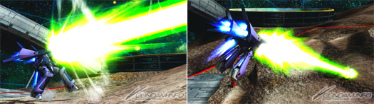 [MS form / flight form] Its sub ranged attack fires a spread mega particle cannon from the fore of its thruster unit.