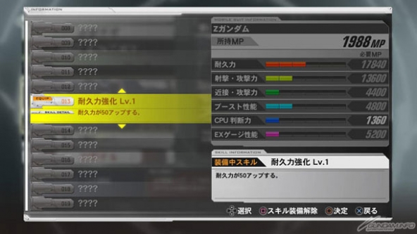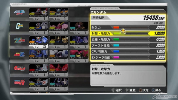 In MS Edit mode, you can use 'MP' gained from missions to upgrade your mobile suit's stats. Upgrade your suit, and clear even the toughest of missions!