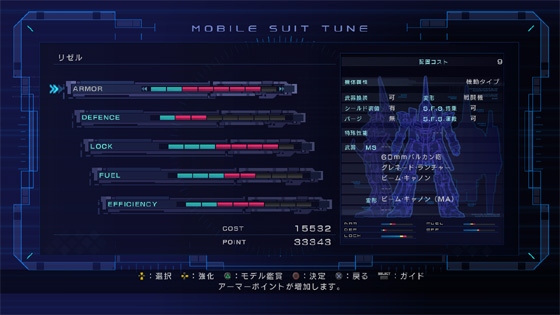 ゲーム中に手に入れられるポイントを使って、モビルスーツや、キャラクター、武装を強化することができるぞ。