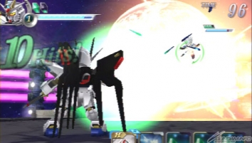 ▲ Strike Freedom Gundam pins down the enemy with its Super DRAGOON while firing its beam rifle.