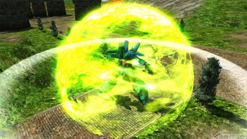 ▲特殊射撃武装は、周囲に緑色のフィールドを発生させ、範囲内の機体をスタン状態にする「プレッシャー」。汎用的な使い方の出来るメイン射撃やチャージ射撃とあわせて、隙のない攻撃が可能となる。