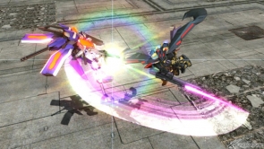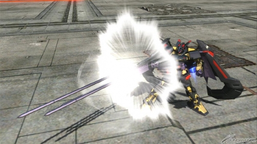 ▲EXバースト「ダンスは終わりだ!」(バーストアタック)では、ランサーダート発射後、ミラージュコロイドで姿を消しつつ接近しトリケロス改で格闘を行った後、マガノイクタチで挟み、錐揉み状態で敵を地面に叩きつける。