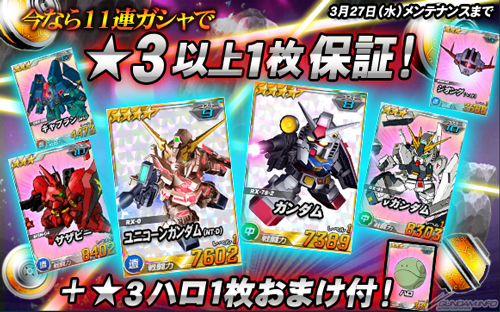 キャンペーンは3月27日(水)までの期間限定で実施され、期間中に「11連エースユニットガシャ」を引くと、「★3」以上のユニットが必ず1機手に入り、さらに「★3ハロ」のカードを1枚追加で入手することができる。デッキを強化するチャンスなのでお見逃しなく。