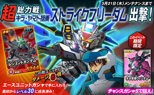 同機を倒した時に引くことができる「チャンスガシャS」には、「ネオ専用ウィンダム」を獲得できるチャンスがあるほか、エースユニットガシャには「ストライクフリーダムガンダム」に対し6倍の攻撃力を発揮する「レジェンドガンダム」が追加される。