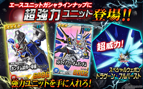さらに本日より「エースユニットガシャ」に、「★4 ガンダム試作一号機フルバーニアン」や「★3 ストライクフリーダムガンダム」など、レアリティの高い強力なユニットが追加された。お得な「11連ガシャ」キャンペーンとあわせて、強力なユニットを手にいれよう。