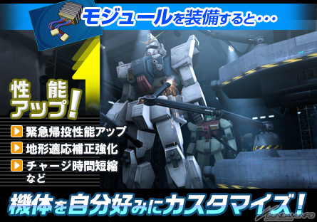 様々な特性を付加できる「バトルアシストモジュール」を装備すると、機体の性能を強化することができる。