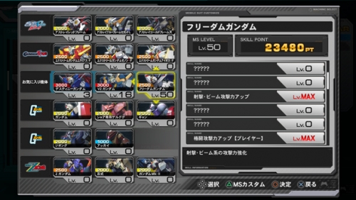 ▲ミッション選択画面で△ボタンを押すと、使用機体の選択画面に移行する。全機体の中から好きなMSを選ぼう。また、「お気に入り機体」の登録枠もあるので、使用頻度の高い機体をあらかじめ設定することもできる。