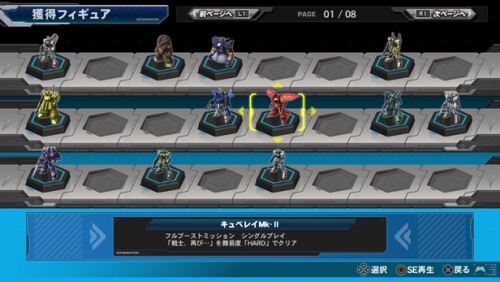 ▲「フルブーストミッション」で獲得したMSのフィギュアはギャラリーに登録される。プレイアブル機体以外のフィギュアも多数ラインナップされているので、ぜひともコンプリートを目指そう。