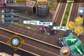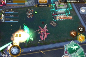 ▲アクションパートでは、最大4人のプレイヤーとの共闘可能。バトルは「ガンダム」ゲームでは珍しいトップビューが採用されている。プレイヤーは性能の異なる様々な機体で戦うことができる。攻撃・ブースト・スキルなど多彩なアクションを駆使してバトルに勝利しよう。