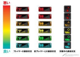オンラインプレイ中は3種類のアイコンで自分や他プレイヤーの通信状況が表示される。