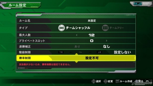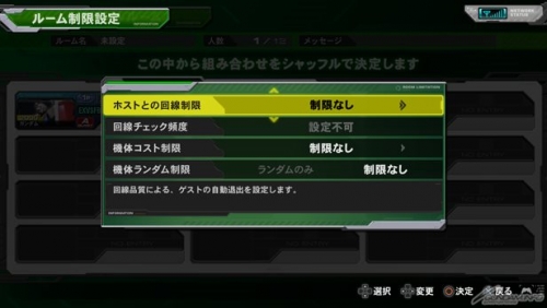 今作からホストがルームに様々な制限をかけられるようになった。回線制限は自動退出とセットになっているほか、コスト制限やランダム制限は条件を満たさないとバトルに参加できない。