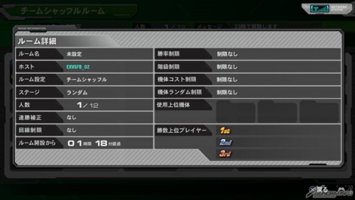 ルームの制限など、ルームの設定を確認できるほか、現在のルームの使用上位機体や勝数上位プレイヤーなどが表示される。