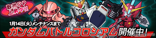 本日から1月14日(火)までの期間限定で「ガンダムバトルコロシアム」、および「獲得PPアップキャンペーン」がスタート。「ガンダムバトルコロシアム」は期間中のみ得られる「VP(ヴィクトリーポイント)」を「ガンダムバトル」などで獲得して「VP」の総量を競うイベントだ。