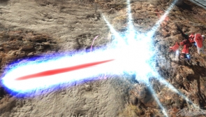 ▲高エネルギー長射程ビーム砲からレーザーを発射する格闘チャージ。照射時間が長くレバー入力で曲げることができるぞ!