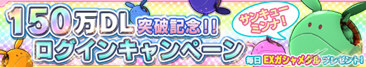 150万DL突破記念「ログインキャンペーン」では、期間中にログインすると1日1回「EXガシャメダル」が3枚プレゼントされ、「フレンドキャンペーン」では、期間終了時にフレンドの登録人数が一定数を超えていると、様々なガシャメダルがプレゼントされる。