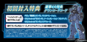 また、通常版および限定版には初回封入特典として、好評配信中のPS3「機動戦士ガンダム バトルオペレーション」で「ペイルライダー」が先行で入手できるプロダクトコードをはじめとした、豪華4大特典ダウンロードコードが付属する。
