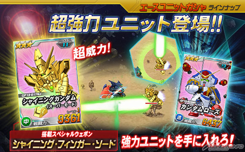 さらに本日よりエースユニットガシャに、「★3 シャイニングガンダム(スーパーモード)」、「★3 ガンダムローズ」が登場。「★3 シャイニングガンダム(スーパーモード)」は、スペシャルウエポン「シャイニング・フィンガー・ソード」を搭載する強力な機体となっているので、ぜひとも手に入れよう。