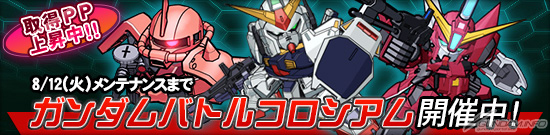 本日より8月12日(火)までの期間限定で、「ガンダムバトルコロシアム」と「獲得PPアップキャンペーン」がスタートした。