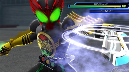 渡部秀氏の熱い掛け声とともに、セルメダルを3枚使ってメダジャリバーから放つ「オーズバッシュ」は、敵を一刀両断する威力を持つ!