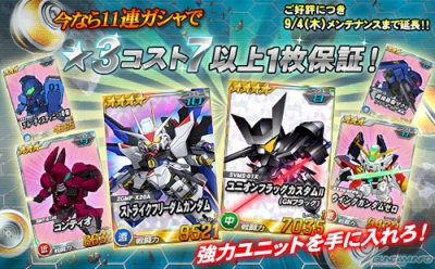さらに本日より「11連ガシャ★3コスト7以上保証キャンペーン」、「ガンダムバトルコロシアム」、「獲得PPアップキャンペーン」、「ログインボーナスキャンペーン」の4つの期間限定キャンペーンとイベントが同時にスタートした。豪華特典盛りだくさんとなっているので、ぜひともチェックしておこう。