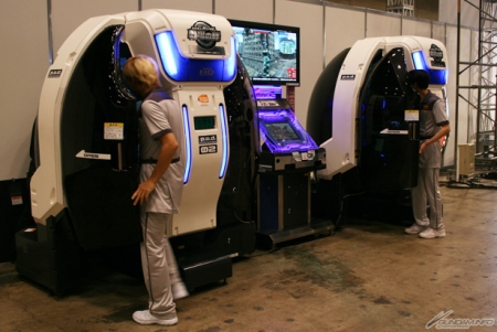▲番組さながらに、筐体に乗り込む板倉氏と森本氏!緊張の1戦だ!