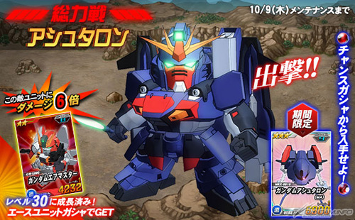 同機を倒した際に引くことができるチャンスガシャには、「★3 ガンダムアシュタロン(MA)」などを獲得できるチャンスがあるほか、エースユニットガシャには「ガンダムアシュタロン」に対し6倍の攻撃力を発揮する「★2 ガンダムエアマスター」が追加される。