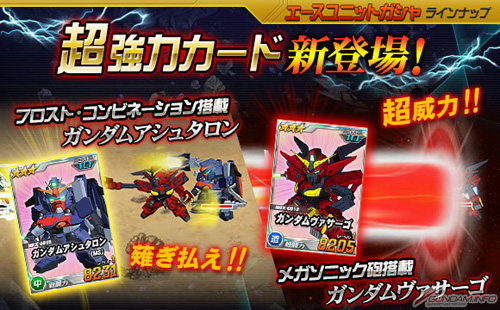 さらに、本日よりエースユニットガシャに「★3 ガンダムアシュタロン(MS)」、「★3 ガンダムヴァサーゴ」が登場。スペシャルウェポンとして、「★3 ガンダムアシュタロン(MS)」は「フロスト・コンビネーション」、「★3 ガンダムヴァサーゴ」は「メガソニック砲」をそれぞれ搭載する強力な機体となっているので、ぜひとも手に入れよう。