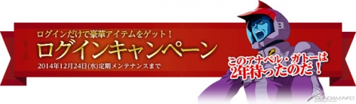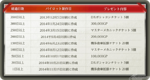 2014年11月19日の定期メンテナンスまでに作成された全てのパイロットを対象に、豪華アイテムがプレゼントされる。作成日時から経過日数が長いパイロットほど多くのアイテムがプレゼントされるので、長く戦線を離れていたパイロットは、ぜひこの機会にログインしてみよう。