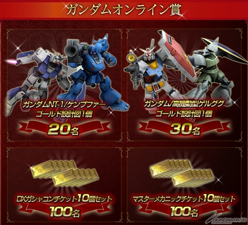 今までに登場した人気機体「ガンダムNT-1」と「ケンプファー」のゴールド設計図が各20名に、「ガンダム」と「高機動型ゲルググ」のゴールド設計図が各30名にプレゼントされる。また、「DXガシャコンチケット10個セット」と「マスターメカニックチケット10個セット」もそれぞれ100名にプレゼントされる。