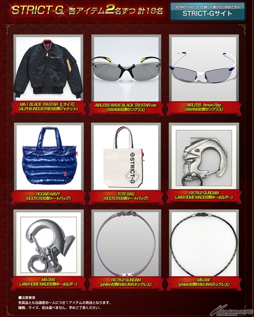 『機動戦士ガンダム』をコンセプトにしたアパレルブランド「STRICT-G」より、9個のアイテムがそれぞれ2名にプレゼントされる。