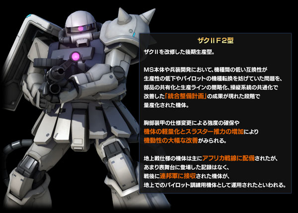 「ザクIIF2型」は、ザクIIを改修を施した後期生産型となる機体。胸部装甲の仕様変更による強度の確保や、機体の軽量化とスラスター推力の増加により機能性の大幅な改善が行われている。地上戦仕様となる機体は主にアフリカ戦線に配備されたものの、あまり表舞台には登場せず、戦後に連邦軍に接収されたといわれている。