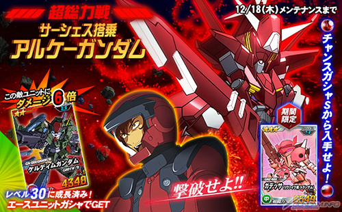 超総力戦には12月18日(木)までの期間限定で「サーシェス搭乗アルケーガンダム」が登場し、期間中に任務を実行すると、まれに遭遇することがある。