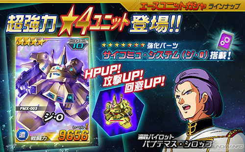 本日よりエースユニットガシャに、強化パーツ「サイコミュ・システム(ジ・O)」を搭載する強力なユニット「★4 ジ・O」が登場。また、プラチナパイロットガシャには「★3 パプテマス・シロッコ」が登場するので、あわせてチェックしよう。