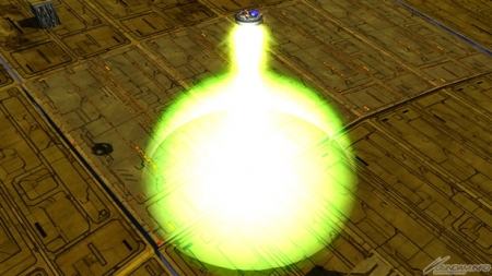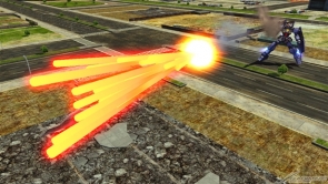 ▲特殊射撃武装「ビーム・シールド【照射】」では、地面に向けてビーム・シールドから照射ビームを発射。照射ビームが着弾した地点には爆風が発生する。