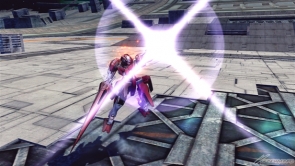 ▲チャージ射撃武装では、両腕部のビーム・シールドを展開し突撃モードに移行する。突撃モード中は、自機左右からの射撃攻撃を防ぐほか、自機正面に攻撃判定が発生する。