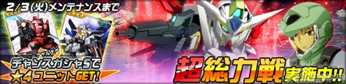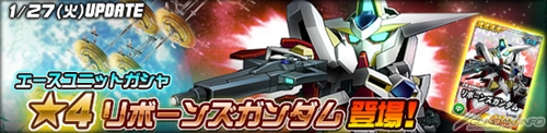 エースユニットガシャに、「★4 リボーンズガンダム」、「★3 アリオスガンダム(MS)」、「★3 高機動型ザクII」が登場した。「★4 リボーンズガンダム」は、強化パーツ「ツインドライブ(Τ)」を搭載した強力なユニットとなっているので、ぜひとも手に入れよう。
