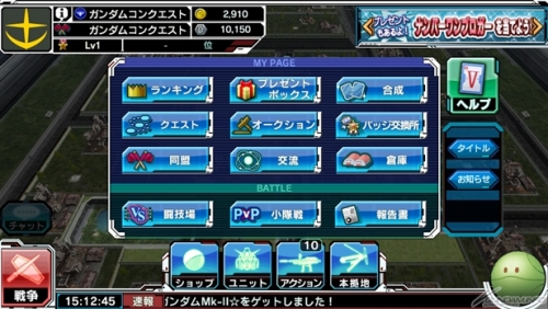 ガンダムコンクエスト 販売価格 : ダウンロード無料、一部アイテム課金 対応機種 : iPhone 4、iPhone 4S、iPhone 5、iPhone 5s、iPhone 5c、iPad(第3世代、第4世代)、 iPad mini、iPod touch(第5世代),iOS4.3以上、Android 2.3以上 ※一部の端末を除く 配信開始 : 2013年12月10日 |