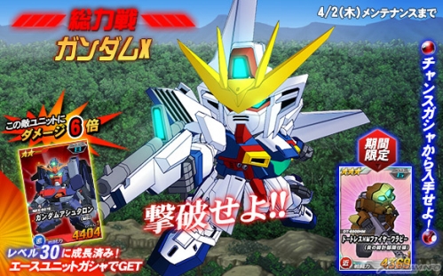 総力戦には4月2日(木)までの期間限定で「ガンダムX」が登場し、期間中に任務を実行すると、まれに遭遇することがある。