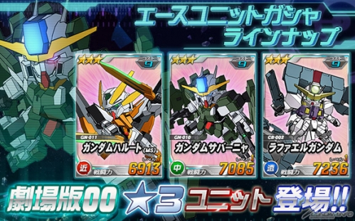 本日よりエースユニットガシャに、『劇場版 機動戦士ガンダム00 ‐A wakening of the Trailblazer‐』より「★3 ガンダムハルート(MS)」、「★3 ガンダムサバーニャ」、「★3 ラファエルガンダム」が登場した。