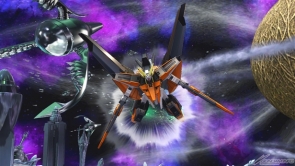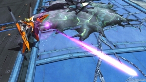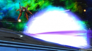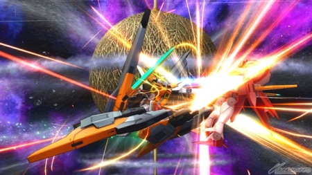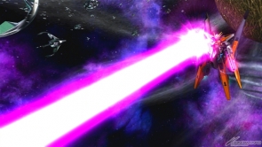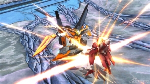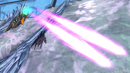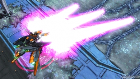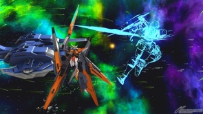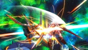 ▲バーストアタックは「未来を切り拓く力」。GNソードライフルおよびGNシザービットを用いた連続格闘攻撃を行った後、GNソードライフルとGNキャノンから照射ビームを発射する。