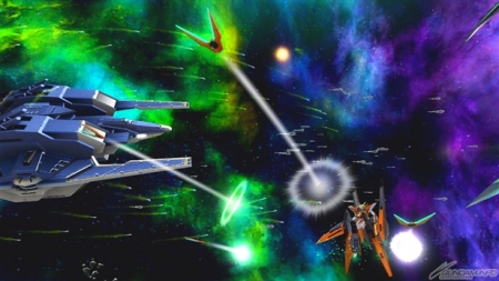 ▲レバー後いれサブ射撃武装では、GNソードライフルとGNキャノンから照射ビームを発射する「一斉射撃」を繰り出す。
