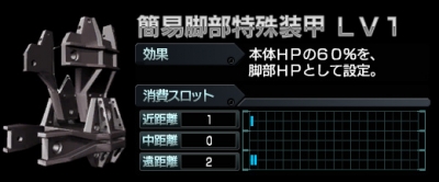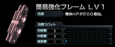 カスタムパーツとしての性能が低い代わりに、消費スロットが大幅に抑えられているため、カスタマイズ後に中途半端に残ってしまいがちなパーツスロットを活用できるカスタムパーツ。