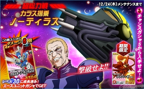 同機を倒した際に引くことができるチャンスガシャSには「★3 クァバーゼ(MS)」などを獲得できるチャンスがあるほか、エースユニットガシャには「カラス搭乗ノーティラス」に対し6倍の攻撃力を発揮する「★2 クロスボーン・ガンダムX3」が追加される。