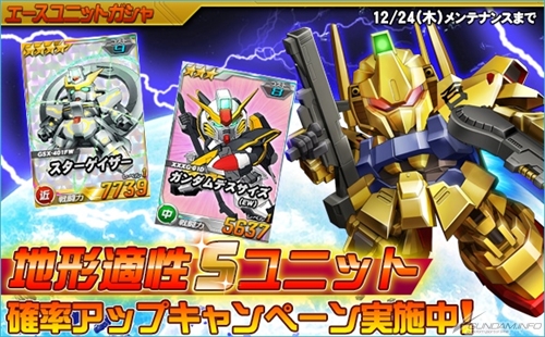 キャンペーン期間中、「エースユニットガシャ」及び「11連エースユニットガシャ」から出現する「地形適性Sユニット」のうち、★3以上のユニットの排出確率がアップする。