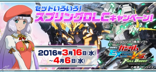 Bandai Namco Entertainment's PS3 title Mobile Suit Gundam Extreme Vs. Full Boost begins a special “Spring DLC Set Campaign” and "GP Bonus campaign" on March 16th.