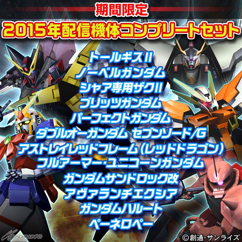 A full set of 12 playable mobile suits released in 2015. Get all the latest suits for just ¥2,856!
