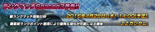 期間中は、4月末に開催予定のランクマッチSeason3で「機体ブースト効果」の対象機体となる「ガンダムデュナメス」を開発・強化できる特別なパーツがドロップする場合がある。この機会に入手・開発しておくと、ランクマッチSeason3開幕後にランポイント獲得が有利になるので、ぜひとも手に入れよう。開催予定期間は4月14日(木)13:59まで。